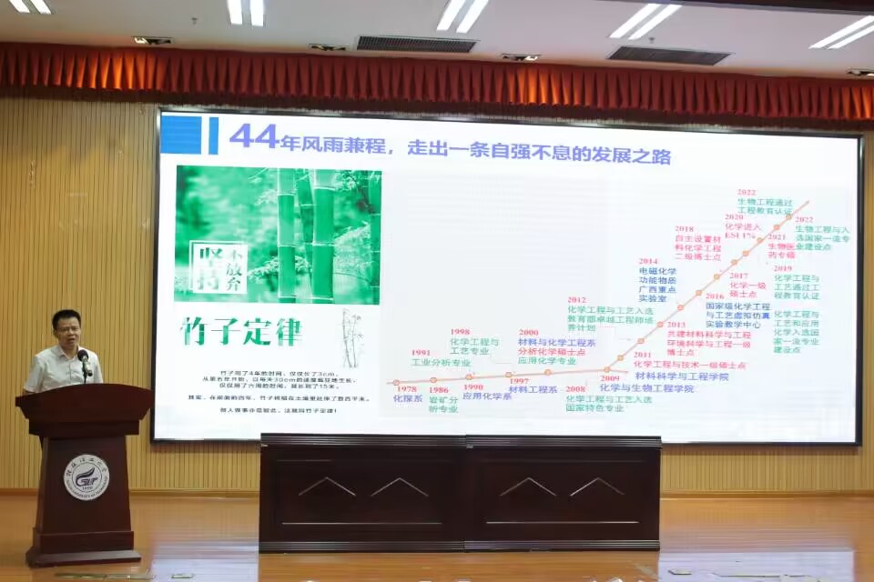 2021级材料与化工专业研究生代表严淑昕对新生表达了对研究生生活的祝福和寄语。2022级研究生新生代表李念表达了对来桂工新阶段、新旅程的期盼和憧憬。