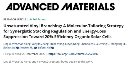 海杰峰教授与东华大学胡华伟教授、香港科技大学(广州)吴佳莹教授团队合作,在有机太阳能电池(OSCs)非富勒烯受体材料设计与光伏性能提升领域取得重要进展。研究成果以“Unsaturated Vinyl Branching: A Molecular-Tailoring Strategy for Synergistic Stacking Regulation and Energy-Loss Suppression toward 20%-Efficiency Organic Solar Cells”为题,在国际材料科学顶级期刊《Advanced Materials》(影响因子28.6)上发表。我校为该论文的第一完成单位,硕士研究生张焱焱为共同第一作者,海杰峰教授为第一通讯作者。